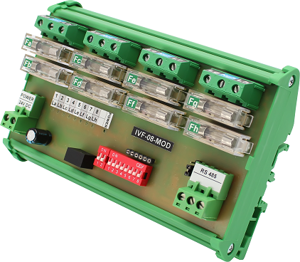The device IVF-08-MOD is designed to monitor failure input voltage. It is used for early indication of circuit breaker failure or fuse failure on various controlled circuits. The control system (remote monitoring) gets feedback on the actual state of controlled circuits through the communication RS 485 MODBUS RTU. If mains voltage appears on input terminals of the device, then it is indicated by lighting of appropriate LED light and setting appropriate bit in the first register of the communication protocol, see the description of registers.